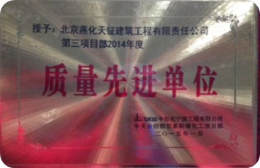 日前,公司第三項(xiàng)目部獲得寧波工程公司中天合創(chuàng)鄂爾多斯煤化工項(xiàng)目部授予的多項(xiàng)榮譽(yù)。其中,項(xiàng)目部獲得2014年度“質(zhì)量先進(jìn)單位”,其承建的煤炭深加工示范項(xiàng)目空分裝置獲得“施工質(zhì)量首件樣板工程”。此外,項(xiàng)目經(jīng)理王俊峰獲得“年度安全之星”,張慶寧獲得“質(zhì)量先進(jìn)個(gè)人”,高吉慶、張巖獲得“HSE安全衛(wèi)士”。