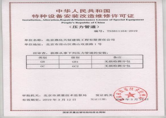 近日,經(jīng)北京市質(zhì)量技術(shù)監(jiān)督局審批通過,我公司取得了中華人民共和國特種設(shè)備安裝改造維修許可證—壓力管道GB1、GC2資質(zhì)證書。該資質(zhì)有效期自2015年3月12日至2019年3月12日。