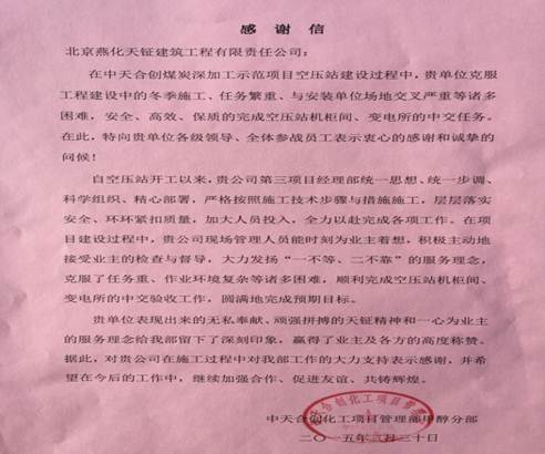對此,中天合創(chuàng)化工項(xiàng)目管理部專門送來一封情真意切的感謝信,認(rèn)為天鉦公司在工程施工中,展現(xiàn)了“無私奉獻(xiàn)、頑強(qiáng)拼搏”的精神和“一心為業(yè)主服務(wù)”的理念,贏得了各方贊揚(yáng)。