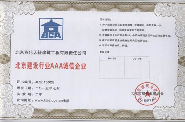 祝賀我公司獲得2014年度北京建設(shè)行業(yè)誠信企業(yè)、北京建設(shè)行業(yè)AAA誠信企業(yè),并在《北京市建筑施工總承包企業(yè)及注冊建造師市場行為信用評價管理辦法》中為公司連續(xù)保持信譽(yù)分5分的成績。