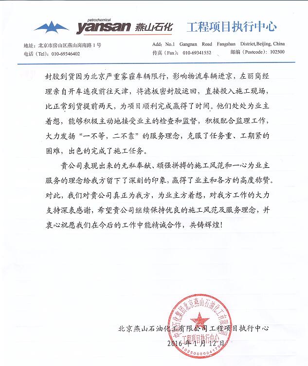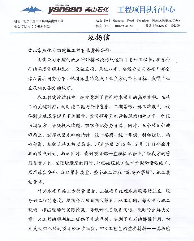 威立雅外排水提標改造項目獲燕化公司工程項目執(zhí)行中心表揚