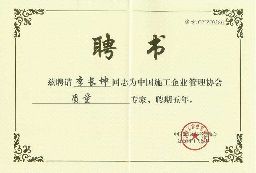 祝賀天鉦公司副董事長李長坤同志被聘為中國施工企業(yè)管理協(xié)會國家優(yōu)質工程現(xiàn)場復查專家!